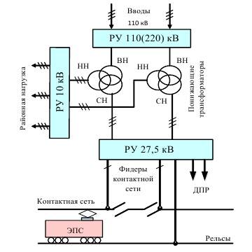 Рассмотрим структурную схему тяговой подстанции переменного тока. Основные функциональные узлы подстанции (рисунок 2.7): РУ 110 (220) кВ; понижающие трех обмоточные трансформаторы; РУ 10 кВ; РУ 27,5 кВ. Для электроснабжения потребителей, расположенных вдоль железных дорог, применяется система ДПР (два провода-рельс), питающаяся от шин РУ 27,5 кВ. От РУ 10 кВ получают питание районные или не тяговые потребители.