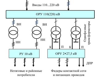 Подстанции системы переменного тока 2х25 кВ также получают питание от ЛЭП 110 (220) кВ.