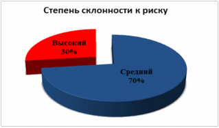 70% испытуемых имеют среднюю степень склонности к риску (показатель в пределах нормы), что, как правило, благоприятно сказывается на выполнении данного вида деятельности. 30%-респонденты, составляющие категорию лиц, склонных к риску (рисунок 3.3).