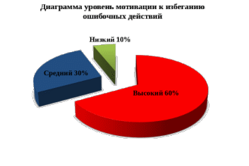 В результате проведённого исследования, было выявлено, что большинство респондентов (60%) имеют высокий уровень мотивации к избеганию ошибочных действий. Средние показатели имеют 30%. и, количество респондентов, имеющих низкий уровень мотивации к, ошибочных действий, составляет 10% от общего числа (рисунок 3.2).