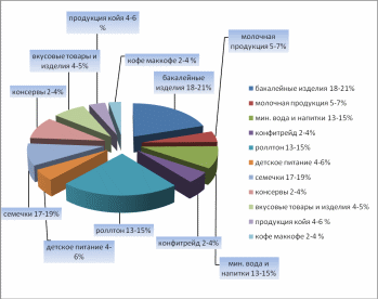 Минеральная вода – 14,2%, Роллтон – 14,7%, молочные, кисломолочные продукты – 6,2%, остальные товары – менее 6%.