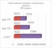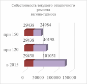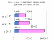 По результатам анализа себестоимости ремонта было выявлено ее значительное повышение в 2015 году, что обусловлено снижением объема отремонтированных вагонов в пределах 33,5 % к уровню 2014 года и как следствие увеличение доли накладных расходов, и изменением доли накладных расходов за счет реструктуризации РВД «Уссурийск» в октябре 2014 года, при выделении из состава РВД «Уссурийск» механиков рефрижераторных секций и создании РЭУ «Уссурийск»-осп РВД «Троицк», которые являясь основными производственными рабочими наравне с рабочими на ремонте подвижного состава являлись базой для распределения накладных расходов. Таким образом, в 2013 и 2014 году процент накладных расходов к фонду оплаты труда основных производственных рабочих был 140,3 % и 150,2 % соответственно, а в 2015 году составил 932,5 %, увеличив себестоимость ремонта до 88,9 тысячи рублей за один вагон отремонтированный текущим отцепочным ремонтом.
