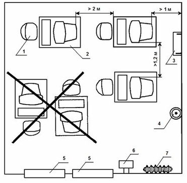 1 - кресло; 2 - столешница; 3 - настенный аэроионизатор; 4 - огнетушитель; 5 - окна; 6 - воздухоочиститель; 7 - батарея центрального отопления.