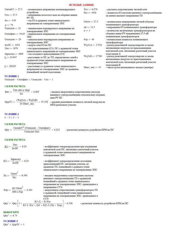 После выбора устройства поперечной компенсации реактивной мощности нужно произвести проверку по условию «Условие 3», согласно которому мощность КРМ не должна быть больше или равна средней реактивной мощности тяговой нагрузки на расчётном участке. Если результат проверки удовлетворительный, то устройство поперечной компенсации реактивной мощности выбрано верно, а в том случае, если результат проверки не неудовлетворительный, то выбираем КРМ меньшей мощности.