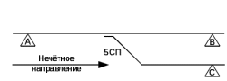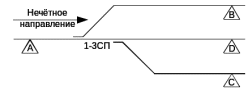 для стрелочной секции с одной стрелкой, входная цепь (А) подключается к счётному пункту СП, ограничивающему разветвлённый участок со стороны остряков стрелки. Подключения входных цепей (В, С) произвольное, входная цепь (D) не используется, положение перемычек на кроссовой плате КБР соответствует коду конфигурации «0100» , как показано на рисунке 2.5;