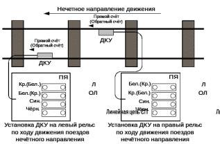 В случае, когда ДКУ устанавливается на левый рельс по ходу движения поездов нечётного направления, красная жила соединительного кабеля ДКУ подключается к проводу линейной цепи СП, а белая - к проводу ОЛ [3];