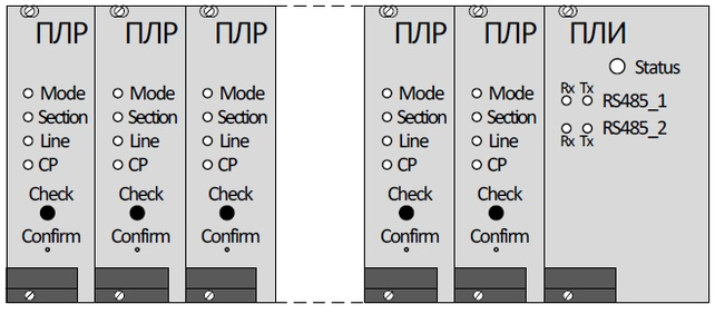 Согласно цоколёвке (приложение А) в группах клемм Х1-Х15 объединены клеммы входных и выходных цепей ПЛР1-ПЛР15 соответственно. Пары клемм «+Кн.А» и «-Кн.А», «+Кн.В» и «-Кн.В», «+Кн.С» и «-Кн.С», «+Кн.D» и «-Кн.D», образуют двухпроводные цепи А, В, С, D соответствующее ПЛР. Клеммы «Фронт.0», «Общ.0», «Тыл.0» и «Фронт.1», «Общ.1», «Тыл.1» предназначены для подключения внешних цепей к двум встроенным в ПЛР переключающим контактным группам, гальванически изолированным друг от друга, а также прочих внутренних цепей ПЛР «сухие контакты». Клеммы «+Сброс участка 0», «-Сброс участка 0» и «+Сброс участка 1», «-Сброс участка 1» предназначены для подключения внешних цепей сброса счётчика осей СО участка пути, контролируемого данной ПЛР. Группа клемм Х16 предназначена для подключения двух цепей интерфейса RS-485: цепи обмена данными с постовым терминалом (шина ПТ) и цепи обмена данными с внешними устройствами (шина внешних устройств). Клеммы Х16-10 «1Data+», Х16-11 «1Data-», Х16-11 «1GND», Х16-12 «2Data+», Х16-13 «2Data-», Х16-14 «2GND» предназначены для подключения шины ПТ и шины внешних устройств. Клеммы Х16-15 «1Data+», Х16-16 «1Data-», Х16-17 «2Data+», Х16-18 «2Data-» предназначены для подключения терминатороных резисторов к окончаниям шины ПТ и шины внешних устройств соответственно.