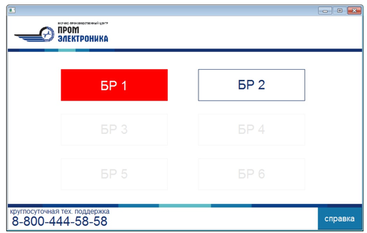 При включении питания постовой терминал ПТ переходит на стартовый экран. Максимальное число подключаемых к ПТ блоков решающих БР – 6. На стартовом экране содержится шесть кнопок, с помощью которых осуществляется просмотр данных каждого БР. Если БР имеет отказ, то кнопка БР горит красным цветом. Не подключённые БР к постовому терминалу ПТ или не имеющие связи с ним – неактивны. Рисунок стартового экрана приведён на рисунке 2.7 [4].