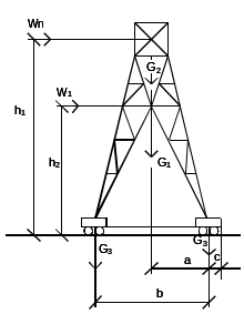 – коэффициент собственной устойчивости, принимаемый равным для кранов грузоподъемностью выше 30 тонн не менее 1,4; – давление ветра на отдельные части конструкции крана, Па; – вес портала, Н;
