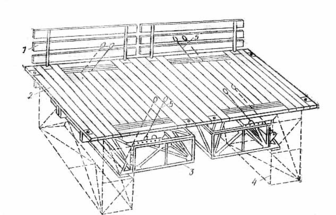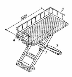 1 – гидроцилиндр для подъема подмостей; 2 – рычаги для подъема подмостей; 3 – ограждения; 4 – ножные педали насоса для подачи давления в гидроцилиндр