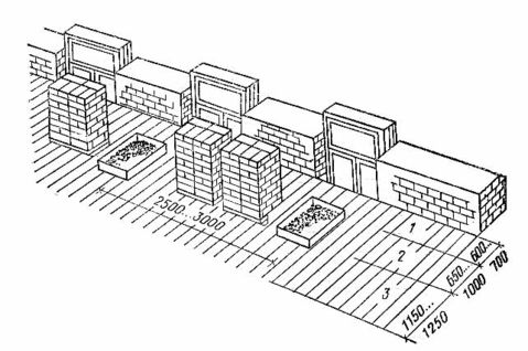 Последовательность выполнения работ с учетом опасных зон устанавливается проектом производства работ. При размещении рабочих мест учитываются основные принципы поточного метода возведения зданий и сооружении, с разбивкой здания на захватки, делянки и ярусы с применением инвентарных лесов и подмостей. Кладка выполняется комплексной бригадой, численный, профессиональный и квалификационный состав которой определяется в соответствии с характером объекта и сроками его возведения. Процесс кладки состоит из нескольких операций и осуществляется коллективно звеном каменщиков, включающим от двух до пяти человек в зависимости от толщины кладки и ее сложности. Рабочее место звена состоит из трех зон (рисунок 5.5): рабочей — свободной полосы вдоль кладки, на которой работают каменщики; зоны для складирования материалов; транспортной, где работают такелажники, при подаче материалов. Делянки располагаются в пределах захватки, разбивка на которые осуществляется с учетом деления здания на секции. При этом работа бригады организуется таким образом, чтобы на одной захватке выполнялась кладка, а на второй подготовительные работы.