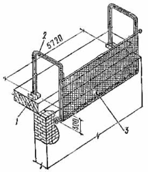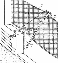 Рис. 5.2 – Улавливающее устройство для кирпичного здания 1 – струбцина для крепления устройства за оконный проем; 2 – подкос для удержания лавсановой сетки; 3 – лавсановая сетка с ячейками 50х50 мм