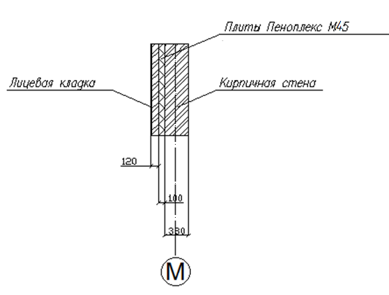 Наружные стены здания - кирпичная кладка толщиной 380 мм, утеплитель Пеноплекс М45, и облицовочный кирпич толщиной 120 мм. Толщина утеплителя определяется по теплотехническому расчету.