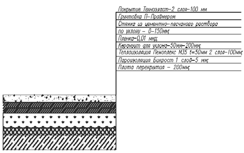Тип покрытия – плоская крыша с организованным внутренним водоотводом. Состав покрытия: железобетонная плита покрытия толщиной 220 мм, выравнивающий слой керамзитового гравия для создания уклона мин.толщиной – 150 мм, утеплитель - пеноплекс М45, стяжка цементно-песчаного раствора М100 толщиной 20 мм, , верхний слой грунтовка П-праймер, покрытие Технопласт в 2 слоя.