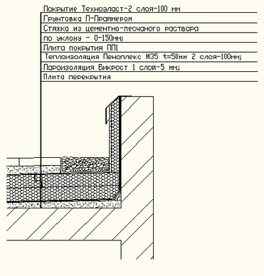 Конструкция кровли представляет собой мягкое, плоское покрытие из рулонных материалов. Рисунок 1.16