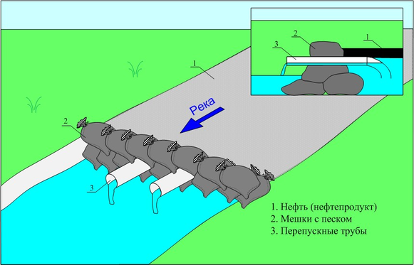 Для водных преград с небольшой глубиной (до 1,5 м) рекомендуется использовать запруды из мешков с песком и перепускных труб (рисунок 2), либо насыпные дамбы (рисунок 3). Необходимость использования этих схем обусловлена мелководностью реки с шириной реки до 60 м, где применение боновых заграждений не эффективно.