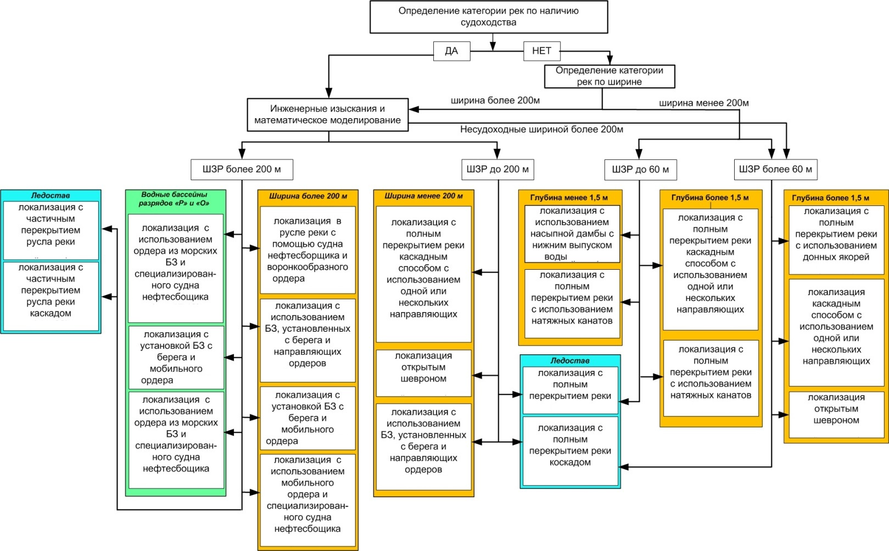 Рисунок 1 – Алгоритм выбора схемы локализации разлива нефти (нефтепродуктов) на судоходных реках, реках с быстрым течением