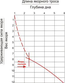 Отношение длины якорной цепи к глубине дна показано на диаграмме 2. Из диаграммы видно, что только при отношении длины троса к глубине дна 2,5:1 достигается достаточная удерживающая способность, и эта величина возрастает при увеличении длины цепи.