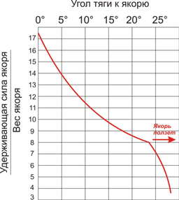 Влияние второго фактора (уменьшение удерживающей силы заякоривания с увеличением угла между морским грунтом и якорным канатом) видно из диаграммы 1 (рисунок 38).