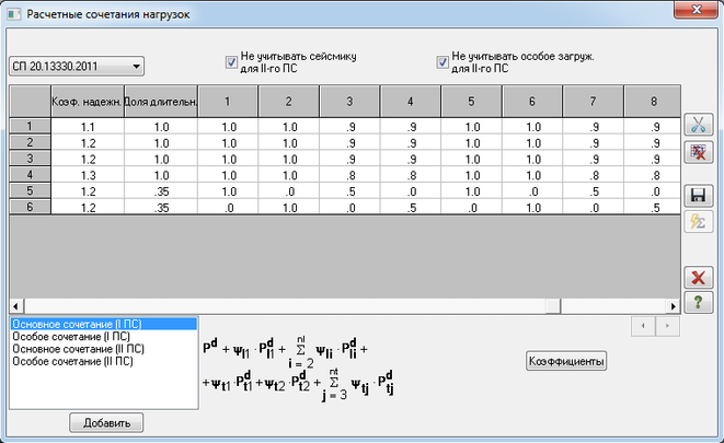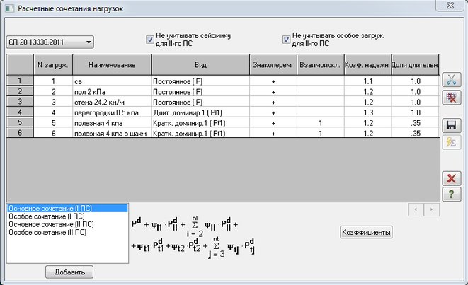 Расчетные сочетания задаются при помощи таблицы расчетных сочетаний нагрузок. Указываются вид нагружения, взаимоисключающие нагружения, уточняются коэффициенты надежности по нагрузке согласно СП 20.13330.2011 (см. рисунок 3.4).