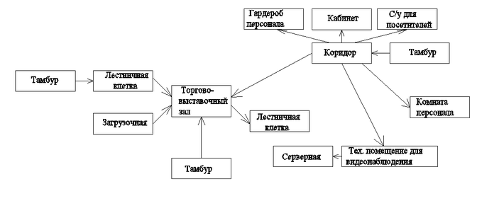 Составим функциональную схему этажа проектируемого здания магазина строительных материалов с указанием всех помещений и связей между ними (рис. 1.1).