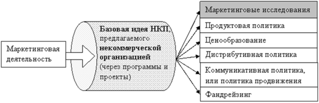 Предлагая рынку НКП, организация, в качестве базовой идеи продукта, предлагает то «желаемое поведение» целевой аудитории или отношение к социальной проблеме, которое общество считает благоприятным, приносящим пользу как целевой аудитории, так и обществу в целом. Эта особенность объясняется тем, что продукт предлагается именно некоммерческой организацией, основным отличием которой является нацеленность на получение «социального эффекта», а не «экономического эффекта». Исходя из этого, организация соответствующим образом строит свою продуктовую, ценовую, дистрибутивную (политику распределения НКП) политику, политику продвижения, а также комплекс приемов для привлечения средств в организацию, или фандрейзинг (Рисунок 1.1).
