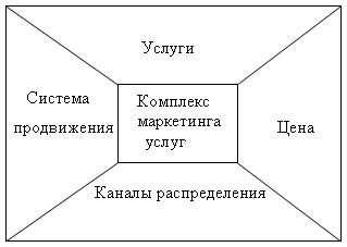 Центральное место в процессе маркетинга услуг занимает разработка комплекса маркетинга. Он включает в себя комплекс маркетинга: услуги как товар, цену услуги, каналы распределения услуг и систему продвижения услуг на рынок (Рисунок 1.2).