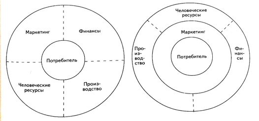 Эволюция взглядов зарубежных компаний на место и роль маркетинга в структуре других функций менеджмента хорошо показана на рисунках 1.2-1.6.