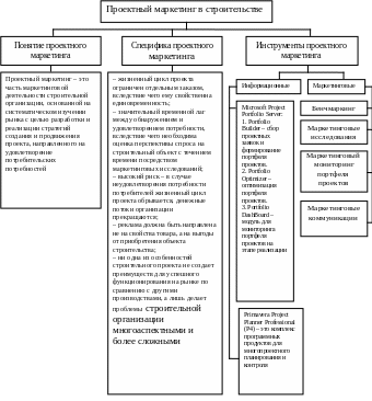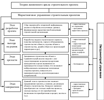 В своем развитии строительный проект проходит несколько этапов, условно называемых «жизненным циклом» проекта. Жизненный цикл проекта – это промежуток времени от момента появления строительного проекта до его завершения. В диссертации показано, что в целом проектный маркетинг в строительстве обладает определенными характеристиками и включает определенный набор инструментов управления (рисунок 1.1) [48].