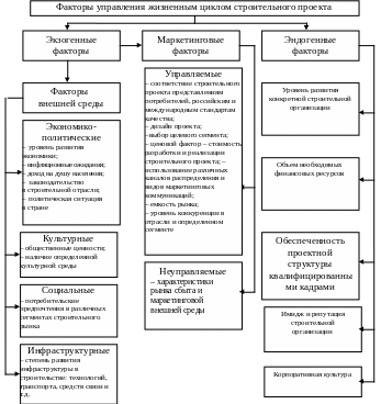 В целом система факторов, влияющих на управление жизненным циклом строительного проекта, может быть представлена следующим образом (рисунок 1.2) [48].