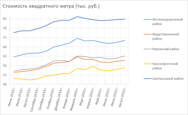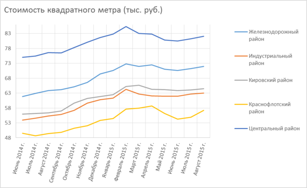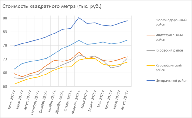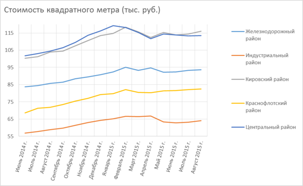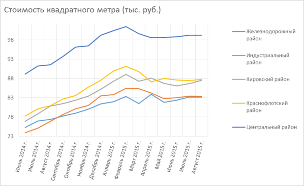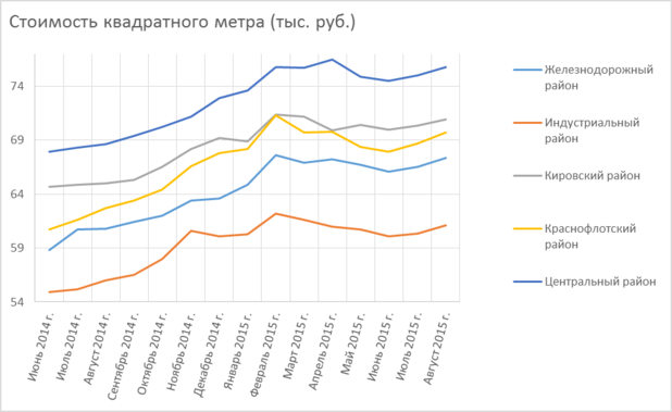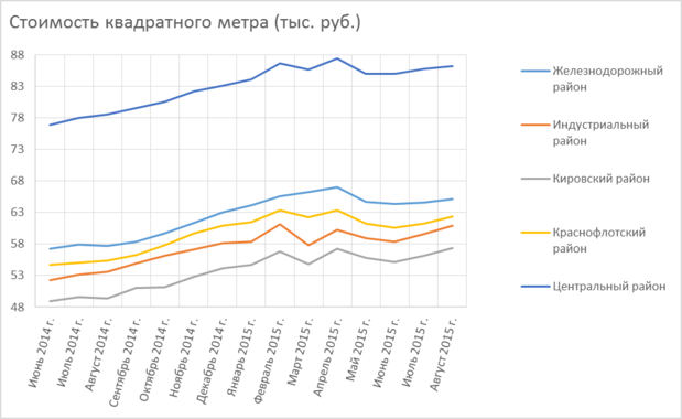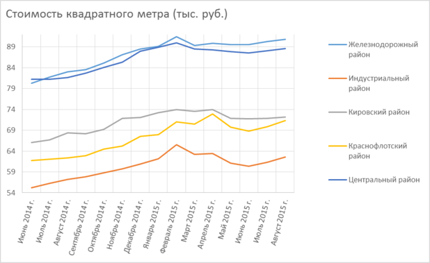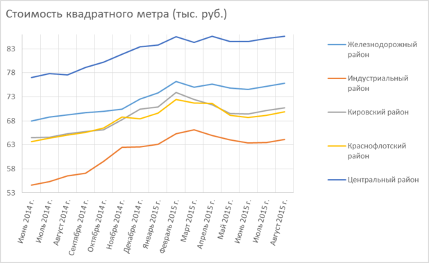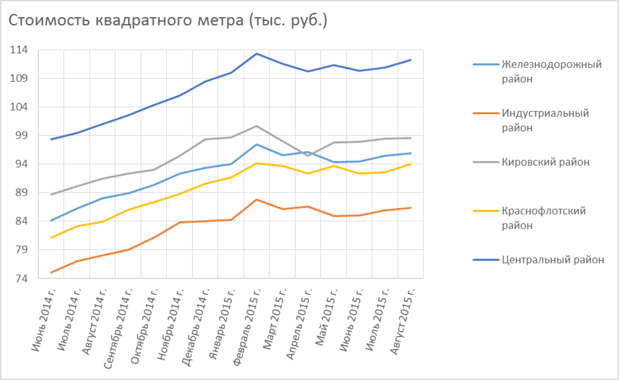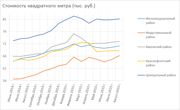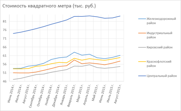 Анализ рынка: поведение рынка по Железнодорожному и Центральному районам идентичное. Кировский район отдельно сохранял тенденцию роста до апреля 2015 г. У Индустриального и Железнодорожного районов произошёл обвал стоимости квадратного метра в апреле и мае 2015 г.