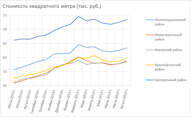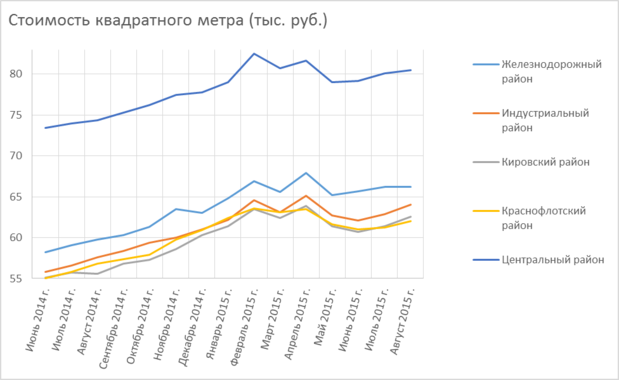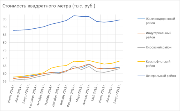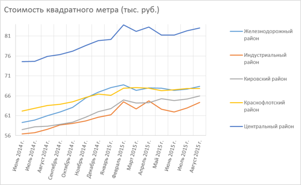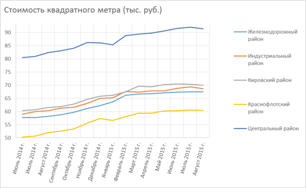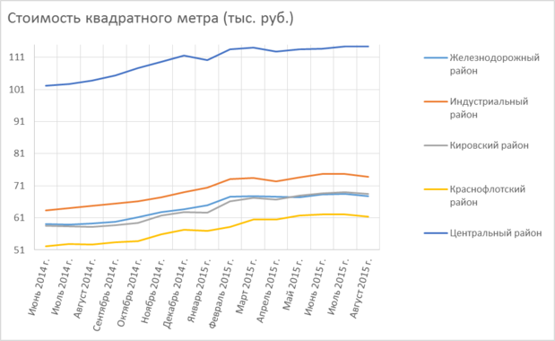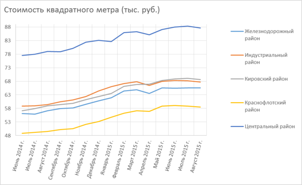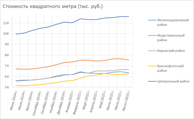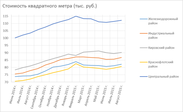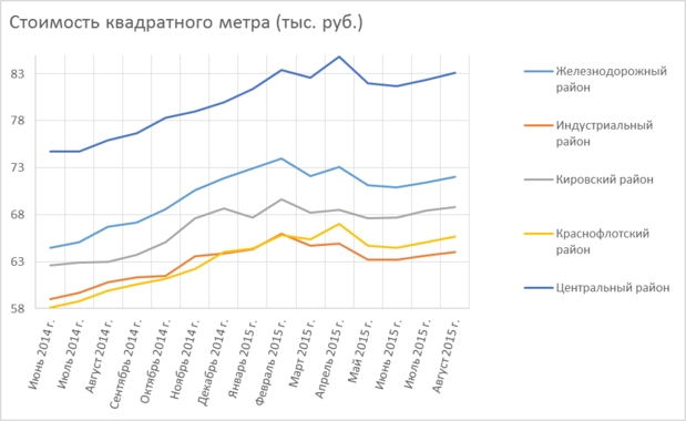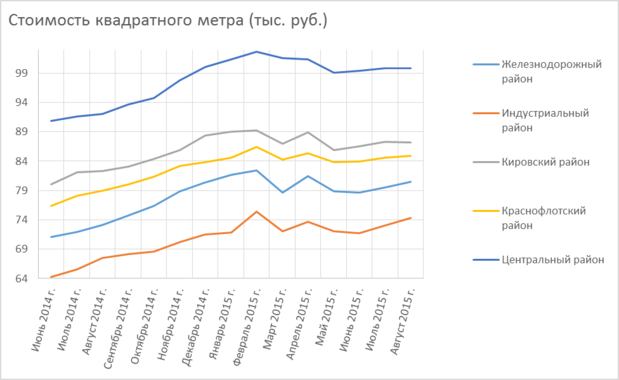 Прогноз рынка: прогнозируется рост цены за квадратный метр у Железнодорожного, Индустриального и Краснофлотского районов (у последнего рост в 1,8%), а в Центральном и Кировском районе изменения стоимости жилья не наблюдается.