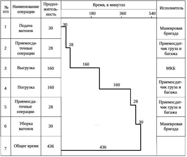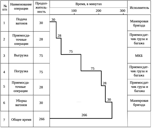 Грузовой фронт контейнерной площадки одинадцатого тупика составляет 203 метра, по вместимости в вагонах - 14 условных вагонов. Длина подкрановых путей - 203 метра, ширина - 16 метров. Контейнерная площадка вмещает в себя 306 пятитонных контейнеров. Специализируется на погрузке, выгрузке на автотранспорт и в вагоны, сортировке вагонов и хранении среднетоннажных контейнеров. График обработки одной подачи показан на рис. 2.7.