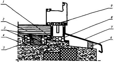 1 - пароизоляционная лента; 2 - подоконная доска; 3 - пенный утеплитель; 4 - штукатурный раствор; 5 - опорная колодка подоконной доски; 6 - шумогасящая прокладка; 7 - слив; 8 - водоизоляционная паропроницаемая лента; 9 - изоляционная саморасширяющаяся паропроницаемая лента