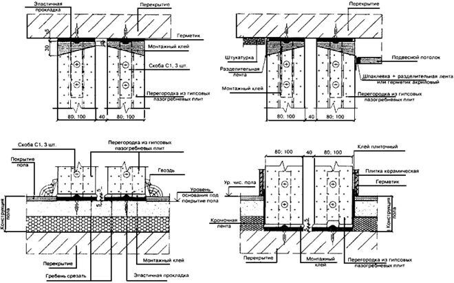Конструктивные решения сопряжения перегородки с ограждающими конструкциями показаны на рисунке 1.20.