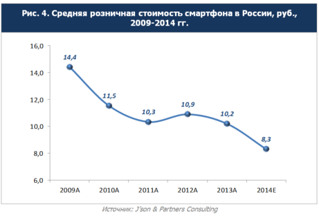 Наряду с ростом бюджетного сегмента, происходит снижение доли «дорогих» смартфонов. Доля ценового сегмента «Более 15 тыс. рублей» снизилась за год на 6%, и по итогам 2014 года составила 13%.