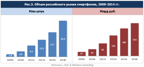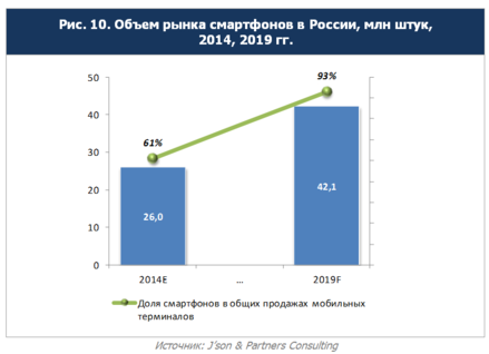 По прогнозам J’son & Partners Consulting, суммарный объем продаж смартфонов в России к 2019 году превысит 42,1 млн. устройств, доля смартфонов в общих продажах мобильных устройств составит 93% [7].