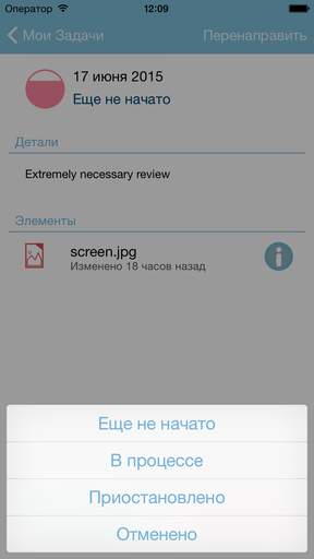 Контроллер PrioritySelectionAlertController используется для выбора уровня приоритета бизнес-процесса при его создании. TaskStatusAlertController отвечает за выбор статуса текущей задачи, его интерфейс приведен на рисунке 3.25.