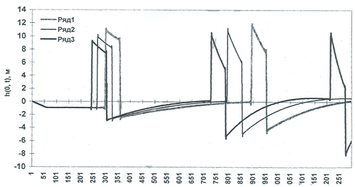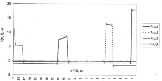 Также представлены графики мгновенного профиля гравитационных волн (рисунок 3.8). При этом начальные данные были следующими: длина водоема (водохранилища)