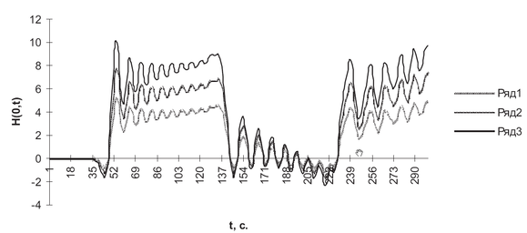 . Компьютерные расчеты значений выражений (2.87) – (2.88) позволяют определить повышение уровня воды у плотины, а также расход и полный объем воды, переливаемой через гребень плотины в зависимости от кинематических и динамических характеристик вторгающейся массы. На рисунках 3.5 – 3.7 представлены графики колебаний глубины водоема у плотины, по которому можно установить зависимость высоты гравитационной волны от времени прохождения лавины или обвала