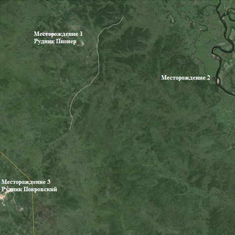 В качестве реального примера тестирования разработанного программного комплекса выбрана группа месторождений, отрабатываемая ГК «Петропавловск». В состав группы входят три месторождения. Месторождение 1 – рудник «Пионер», находящееся в Зейском районе Амурской области, отрабатываемое ГК «Петропавловск», месторождение 2 – условное, месторождение 3 – рудник «Покровский», расположенное в Магдагачинском районе Амурской области. В настоящее время на месторождениях 1 и 3 работают собственные обогатительные фабрики. Локализация месторождений вблизи реки Зея позволяет их рассматривать как группу территориально-сближенных месторождений.