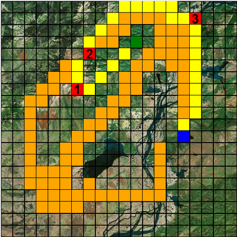 Зеленым цветом показано месторождение, синим – предполагаемое место ОФ, желтым – проложенный маршрут, красным – контрольные точки, выбранные в ходе построения маршрута. Как видно из рисунка, алгоритм построил неоптимальный маршрут, продвигаясь к контрольным точкам 1 и 2. При этом очевидно построение маршрута от месторождения до контрольной точки 2.