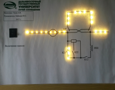 в) поочередно переключать ступени ослабления возбуждения, при этом отобразить в тетради для лабораторных работ отобразить, какие контакторы замыкаются при разных ступенях;