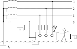 Из этой формулы видно, что ток, протекающий через тело человека, будет уменьшаться при уменьшении сопротивления заземляющего устройства, а также при увеличении общего сопротивления человека.