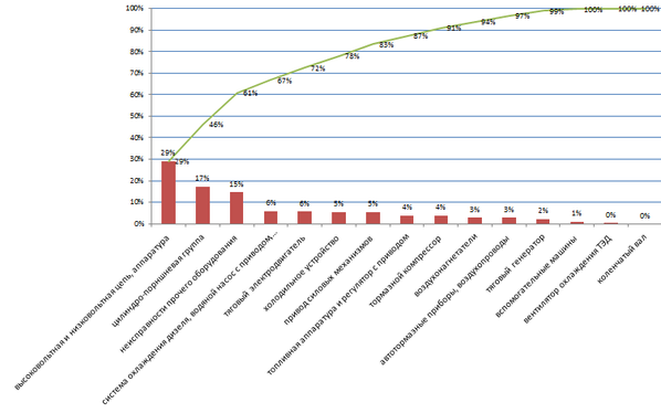 По диаграмме Парето видно, что основными неисправностями влияющими на количество неплановых ремонтов являются: высоковольтные и низковольтные цепи (29 %); цилиндропоршневая группа (17 %); неисправность прочего оборудования (15 %); система охлаждения дизеля, водяной насос с приводом, выхлопной коллектор (6 %); тяговый электродвигатель (6 %); холодильное устройство (5 %); привод силовых механизмов (5 %); топливная аппаратура и регулятор с приводом (4 %); тормозной компрессор (4 %); воздухонагнетатели (3 %); автотормозные приборы, воздухопроводы (3 %); тяговый генератор (2 %); вспомогательные машины (1 %); вентилятор охлаждение ТЭД (0 %); коленчатый вал (0 %).