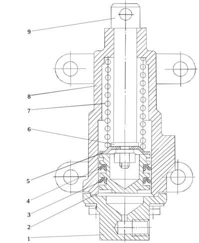 Рисунок 2.6 – Конструкция УКХВ с внешним регулятором давления: 1 – регулировочный стакан; 2 – пружина; 3 – корпус; 4 – втулка; 5 – толкатель; 6 – шток; 7 – шарнир; 8 – указатель; 9 – пробка.