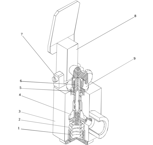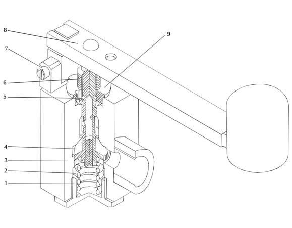 Рисунок 2.5 – Конструкция УКХВ с внешним регулятором давления: 1 – регулировочный стакан; 2 – пружина; 3 – корпус; 4 – втулка; 5 – толкатель; 6 – шток; 7 – шарнир; 8 – указатель; 9 – пробка.