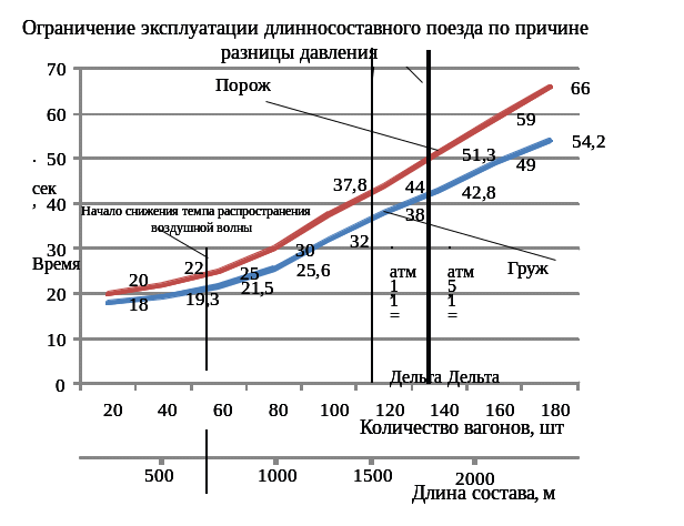 Для наглядности процесса распространения сжатого воздуха по пневматической магистрали поезда представим графики на рисунках 3.5–3.6. Анализируя графики мы видим, что зависимость увеличения времени на процесс заполнения воздухом начинается в переломной точке 40–45 вагонов в поезде или расстояние от локомотива. Именно с этого момента начинаются продольно-динамические реакции. Разница действия отпускных процессов тормоза пока составляет около 2,0–2,5 сек. В зоне ограничения длины поезда по предельно допустимому перепаду давления между его головной и хвостовой частями – это 102–107 вагонов или при длине поезда около 1500 м значение времени имеет разницу с головной частью около 16–18 сек. На рисуноке 3.5 указана зависимость времени срабатывания тормозов длинносоставного поезда от его протяженности