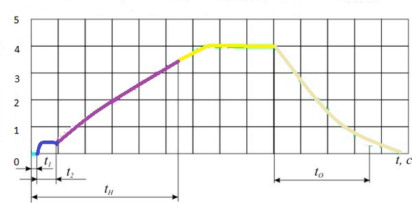 Индикаторная диаграмма торможения и отпуска одного вагона представлена на рисунке 3.8. Где t1 – время от момента постановки ручки крана машиниста в тормозное положение до поступления воздуха в тормозной цилиндр; t2– время поступления воздуха в тормозной цилиндр до прижатия тормозных колодок к колесам (время выхода штока); tн– время наполнения тормозного цилиндра до 95 % максимального давления в нем (обычно до 3,5 кгс/см2); t0 – время отпуска от начала выпуска воздуха из тормозного цилиндра до давления в нем 0,4 кгс/см2.