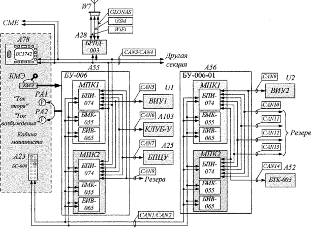 Еще одна новация – это энергооптимальное ведение поезда за счет гибкого формирования тяговой единицы нужной мощности исходя из условий полигона ОАО «РЖД» с количеством тяговых осей до 16 с кратностью 4. Применение выпрямительно-инверторного устройства ВИУ-4000–2М, которое в отличие от ВИП-4000М используется на электровозах 2ЭС5К, состоит из двух независимых каналов плавного индивидуального регулирования питания двух тяговых двигателей в режиме тяги. Расширены функции диагностики ВИУ-4000-2М в сравнении с ВИП-4000М. Блок диагностики контролирует работу двух каналов и принципиально отличается от аналогичного блока ВИУ-4000М наличием канала связи с микропроцессорной системой управления МСУД-015 (рисунок 1.1) [1].
